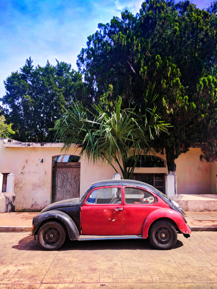VW Bug and Colorful buildings on sidestreet in Valladolid Yucatan road trip 7